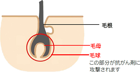抗がん剤は分裂が活発な細胞に強く影響します。毛母細胞は、細胞分裂が非常に活発なため、抗がん剤の影響を受けやすく、その結果脱毛が起こります。