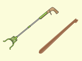 - しゃがむ姿勢は足に負担をかけます。物を取る時にマジックハンドを利用したり、靴を履く時は長い靴ベラなどを利用したりすることで、体の負担を軽減することができます。また、入浴の時は、シャワーチェアなどを使用すると良いでしょう。