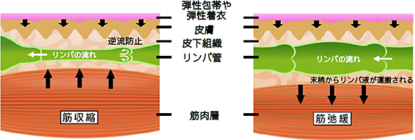 腕の関節を動かすことで、リンパ液の流れをよくすることができます。腕を動かすと筋肉は収縮と弛緩を繰り返します。その筋肉の収縮と弛緩の動きはリンパ管にも作用して、リンパ管内のリンパ液が一定方向に押し出され、結果としてリンパ液の流れがよくなります。これを「筋肉のポンプ作用」と言います。すでにリンパ浮腫と診断がされている方は、弾性包帯や弾性着衣を着用し、圧迫を加えた状態で腕の関節を動かす運動を行います。これを「圧迫しながらの運動」と言います。筋肉のポンプ作用に外から圧迫を加えると、この筋肉の収縮作用と圧迫の相乗効果でリンパ液の流れはいちだんとよくなり、むくみの状態が改善されやすくなります〈図4〉。
