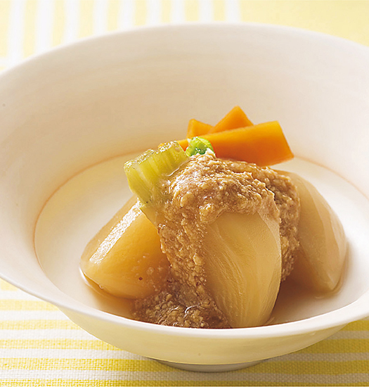 - なべに1を並べて水を加えて火にかけ、煮立ったら弱火にし、めんつゆを加えて落としぶたをして、煮汁が大さじ2程度になるまで煮る。かぶとにんじんは器にとり出す。