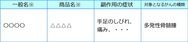 静岡がんセンターのサイトで薬剤名、末梢神経障害の症状、対象となるがんの種類について知ることができます。